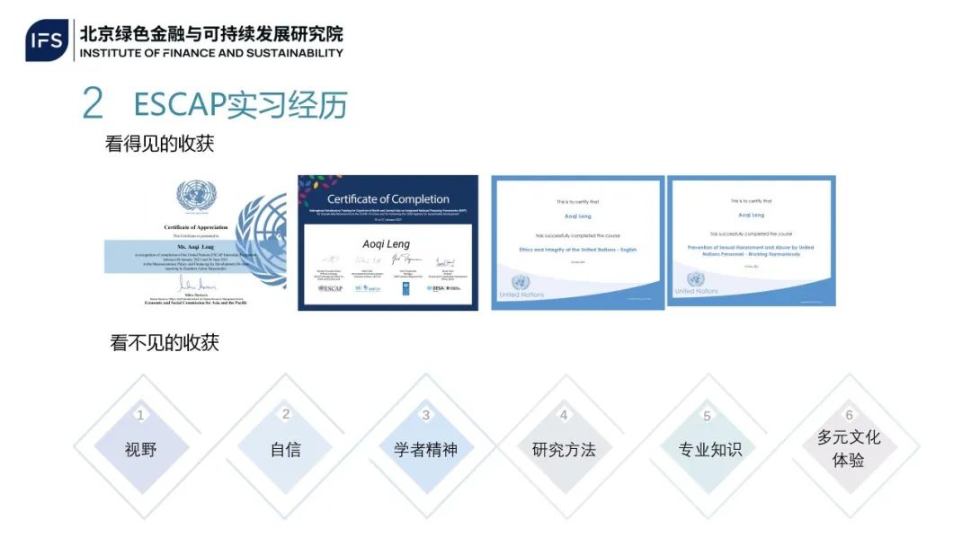 谈及在国际治理创新研究院和亚太经社会实习的收获,冷奥旗从“看得见的收获”和“看不见的收获”两个角度对她的实习经历进行了总结。在这段经历中,她不仅获得了联合国实习以及参与相关项目培训的证书,更重要的是在“视野、自信、学者精神、研究方法、专业知识、多元文化体验”六个方面得到了全面且持续地提升。