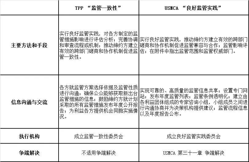 新达成的USMCA中将良好监管实践单独成章(第二十八章),而于1994年正式生效的NAFTA中并没有具体监管相关内容。TPP中对监管一致性同样给予了较大的关注,提出成立监管一致委员会,实施良好监管实践,完善协调和审查流程或机制,构建合作监管机制。下表为TPP“监管一致性”和USMCA“良好监管实践”相关规则专题比较: