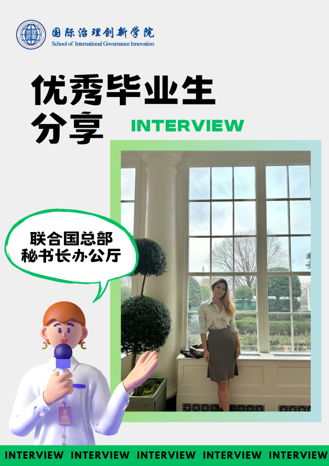 江梓君,国际治理创新学院、新闻与传播学院2020级学生,2022年获得广东外语外贸大学新闻与传播硕士学位,2022年至2023年间公派赴美国马里兰大学学习,2023年8月获得马里兰大学公共管理硕士学位。2023年9月开始在联合国总部秘书长办公厅实习。