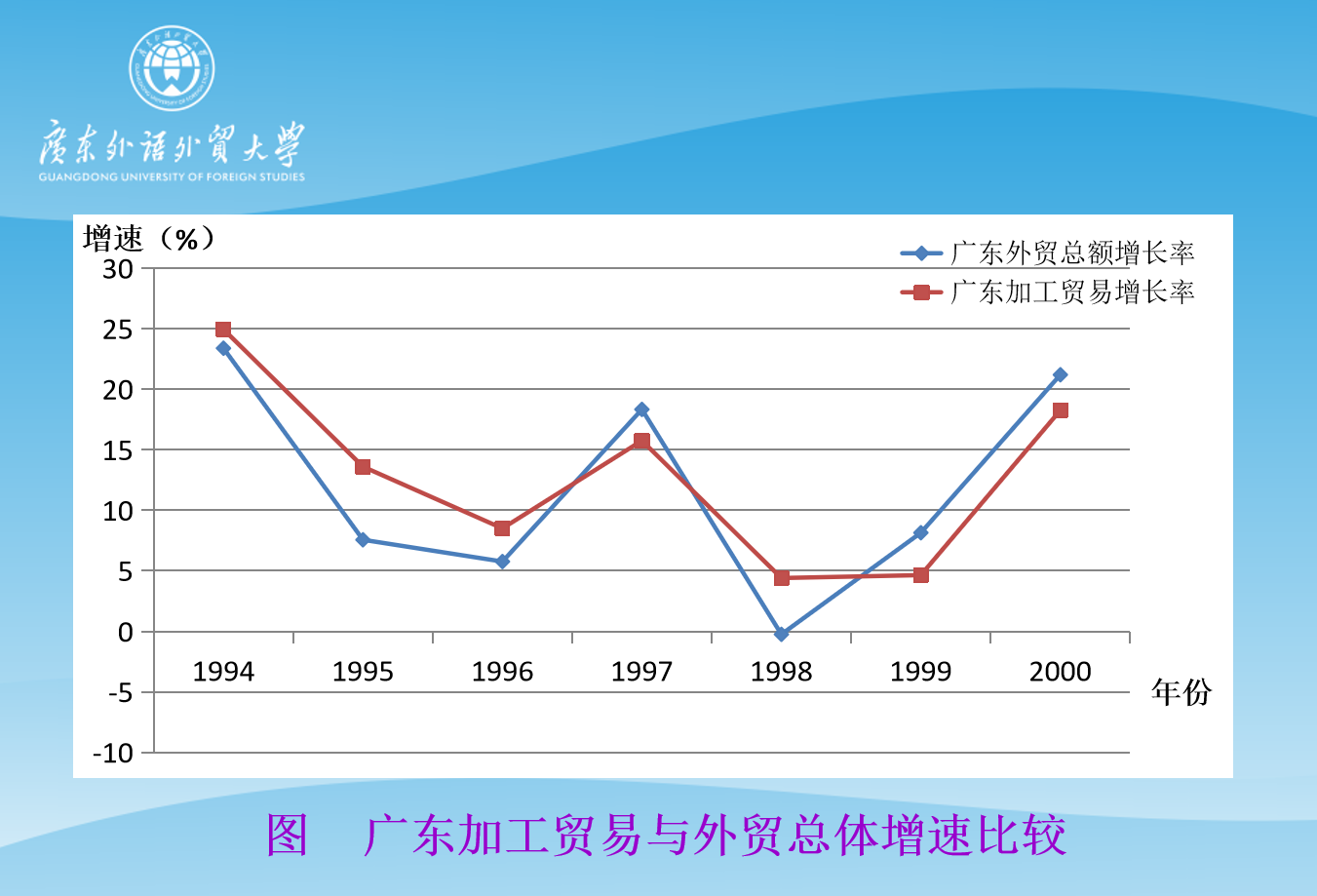 在对全球价值链和加工贸易有了充分的梳理之后,陈万灵教授聚焦于广东加工贸易,运用真实精确的数据与清晰易懂的图表,阐释了加工贸易在不同时期的增长与地位变化。他强调,在90年代后期,政策作用开始由先前的鼓励转变为中性。进入了21世纪之后,中国加入WTO,外贸出现“超常规”增长,而加工贸易在保持高速增长的同时也显现出了疲态,地位开始下降,针对加工贸易的限制性措施也随之增多,国际金融危机叠加,转型升级迫在眉睫。对此,陈万灵教授基于国际国内经贸环境,就加工贸易发展的问题及其转型升级必然性进行了一定的阐述。