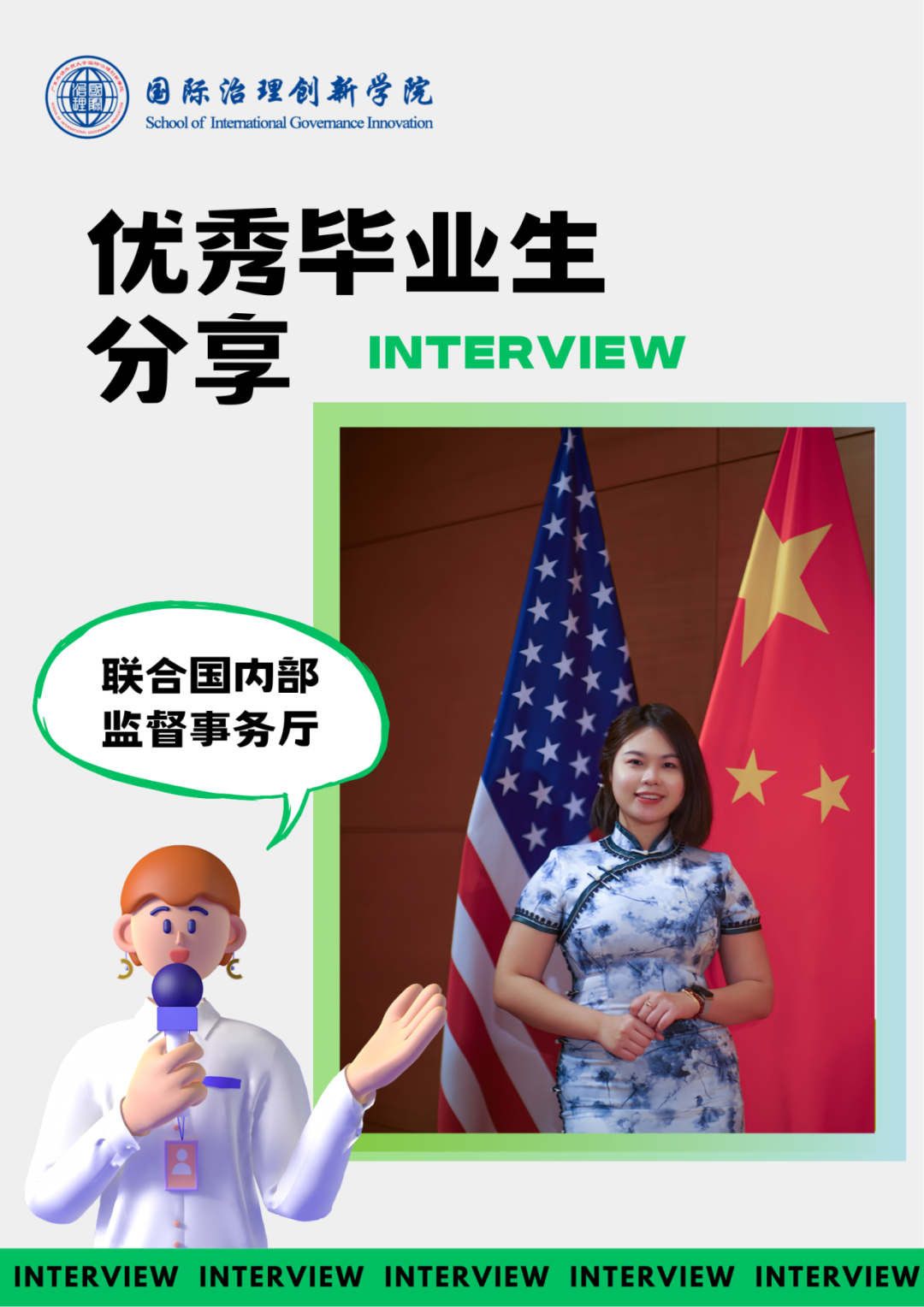 最近吴晔同学成功获得联合国内部监督事务厅(Office of Internal Oversight Services,OIOS)内部审计岗位实习机会,成为国际治理创新学院首位进入联合国内部监督部门实习的专业人才。吴晔同学的成功不仅刷新了学院国际治理人才输送的新版图,而且进一步证明学院“五位一体”创新型人才培养模式的科学性和合理性。
