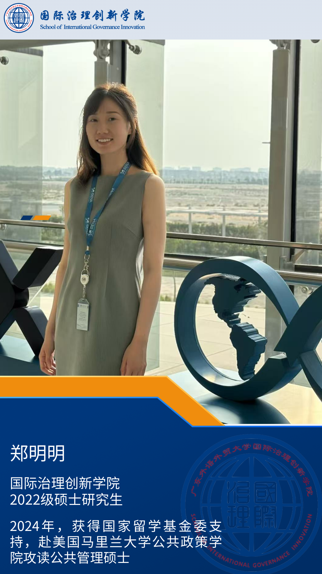 在广东外语外贸大学攻读商务英语研究以及国际治理期间,郑明明系统学习了国际经济法、国际胜任力等课程,为理解国际规则体系、组织治理逻辑及跨文化协作奠定了坚实的理论基础。