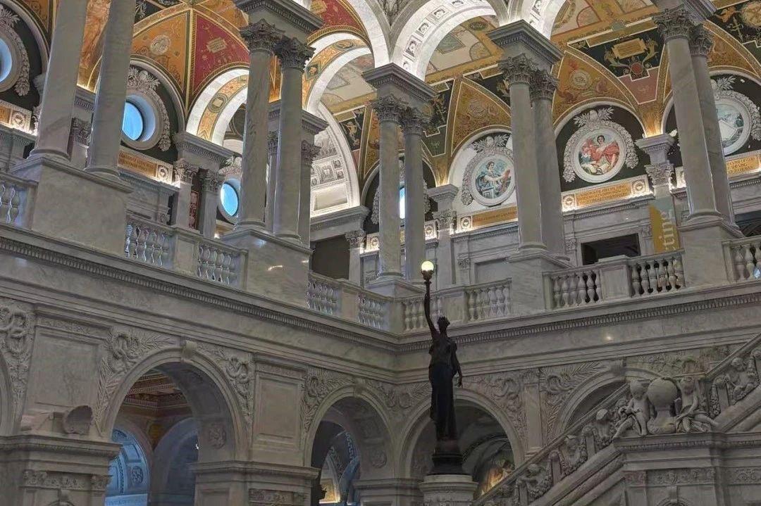 美国东部时间2025年4月7日,国际治理创新学院2022级学生在马里兰大学公共政策学院(School of Public Policy)老师的带领下访问了美国国会图书馆(Library of Congress),与美国国会研究部等相关部门进行座谈交流。作为世界规模最大、馆藏资源最为丰富的图书馆之一,美国国会图书馆不仅承担着为国会提供政策信息支持的重要职责,同时也在文化保存与国际交流方面发挥着举足轻重的作用。