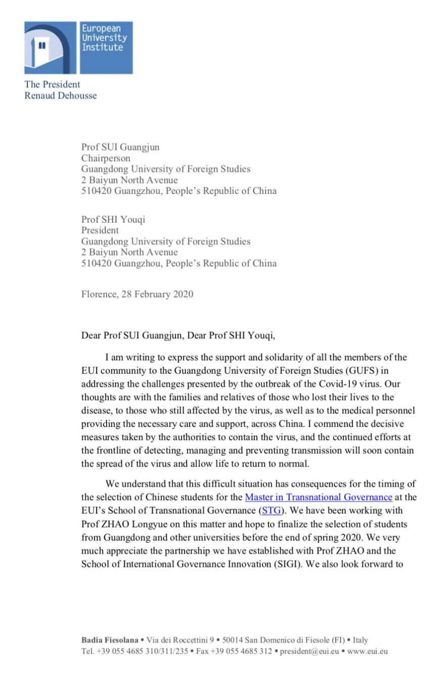 在2020年我国全力抗击疫情之际,欧洲大学学院雷诺·德乌斯校长专门发来慰问信,对我国应对疫情的果断举措表示高度赞赏。斯图布院长通过视频会议,共同商讨在疫情条件下选拔优秀中国学生参与EUI跨国治理硕士研究生项目的办法,进一步深化与国际治理创新学院的全面合作关系。在双方的共同努力下,两校成功在2020年正式开启国际治理创新人才项目,国际治理创新学院每年选拔推荐5-10名学生前往EUI跨国治理学院攻读跨国治理硕士学位,具体的招生和合作方案请见微信推送。